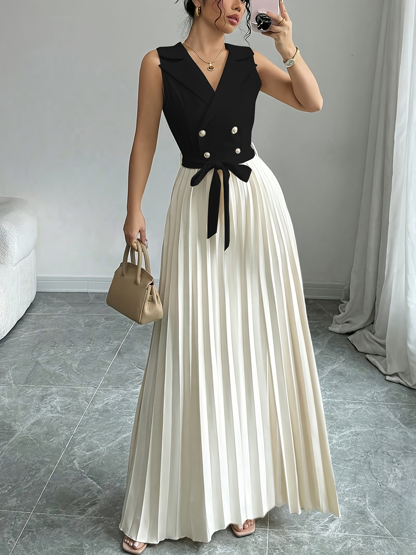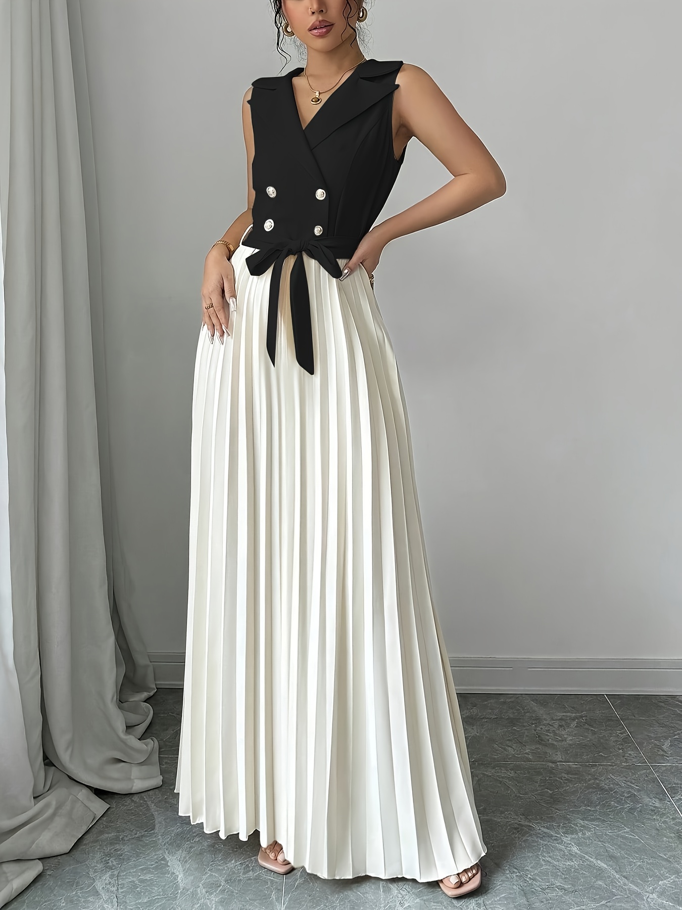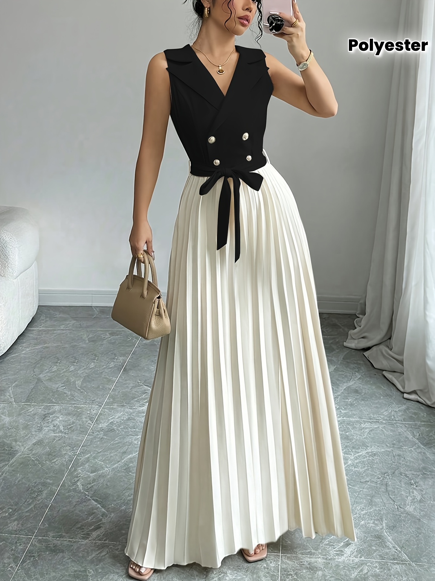 Women'S Elegant Double-Breasted Ruched Sleeveless Dress - Black and White Color Block, Polyester, A-Line Silhouette, Perfect for Spring/Summer Commute and Casual Attire, Casual Attire|Ruched Texture|Polyester Dres