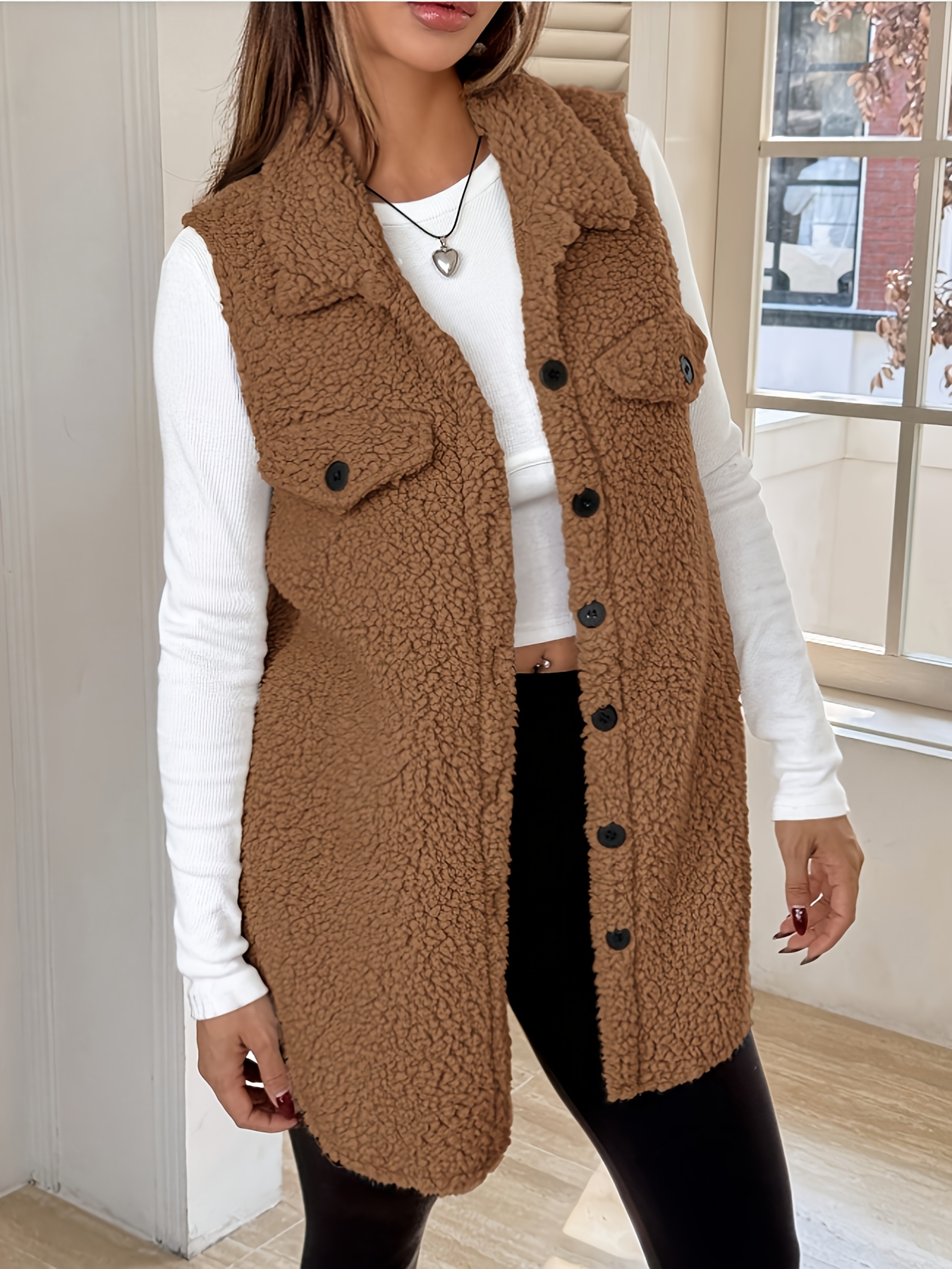 Women'S Elegant Sleeveless Flat Collar Button Front Jacket with Faux Pockets - Cozy Brown Plaid Pattern, Long Length, Perfect for Fall/Winter Casual Wear, Winter Clothes