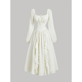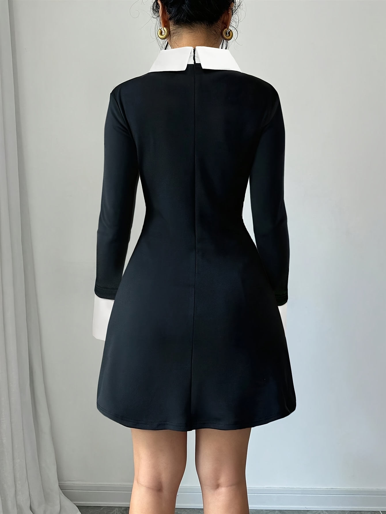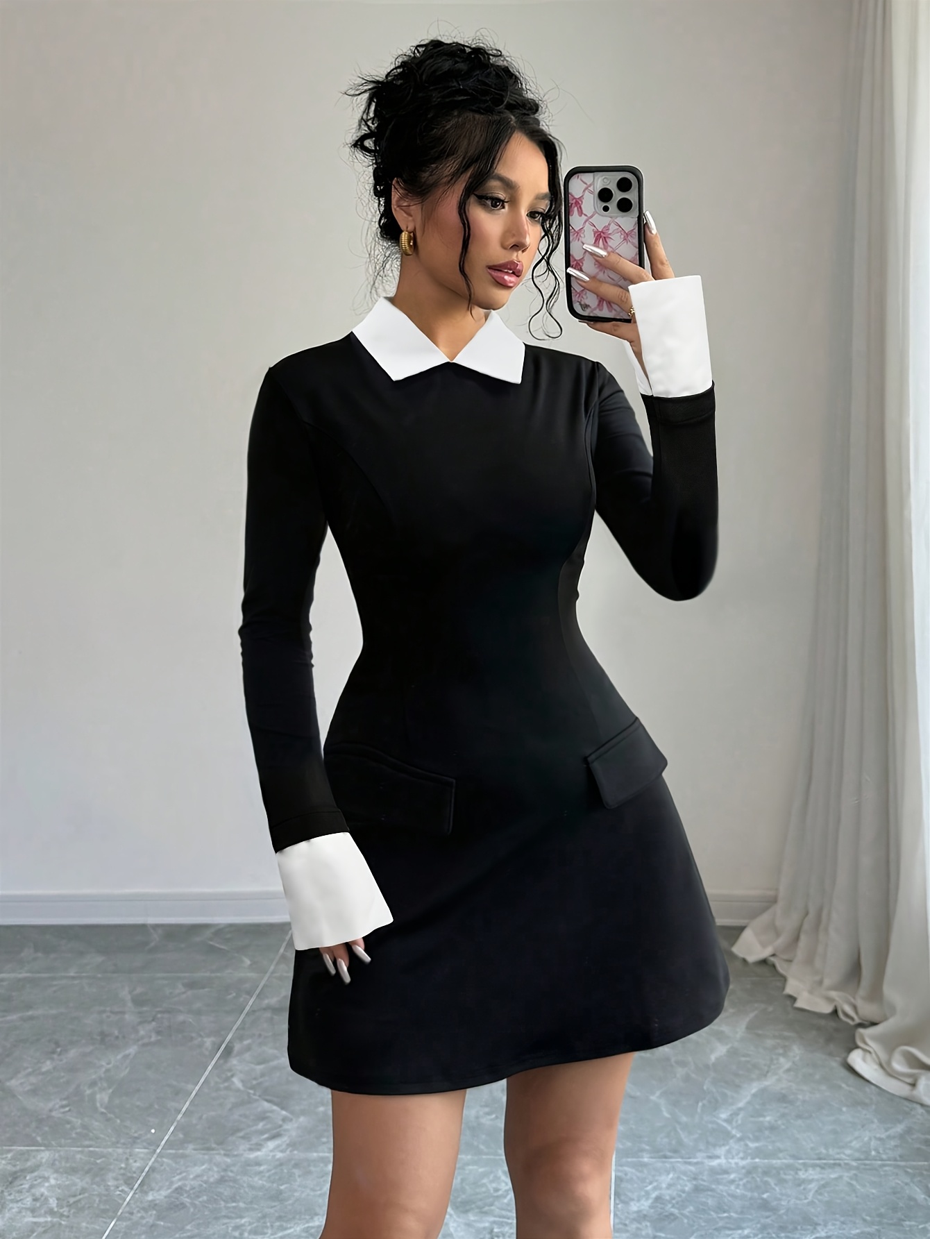 [Elegant Formal Dress] Elegant & Sophisticated Women's Black & White Formal/Office/Party Dress - Long Sleeve Mock Pocket, Structured H-Silhouette, Machine Washable - Professional & Evening Outfits, Office Attire, Polished Finish