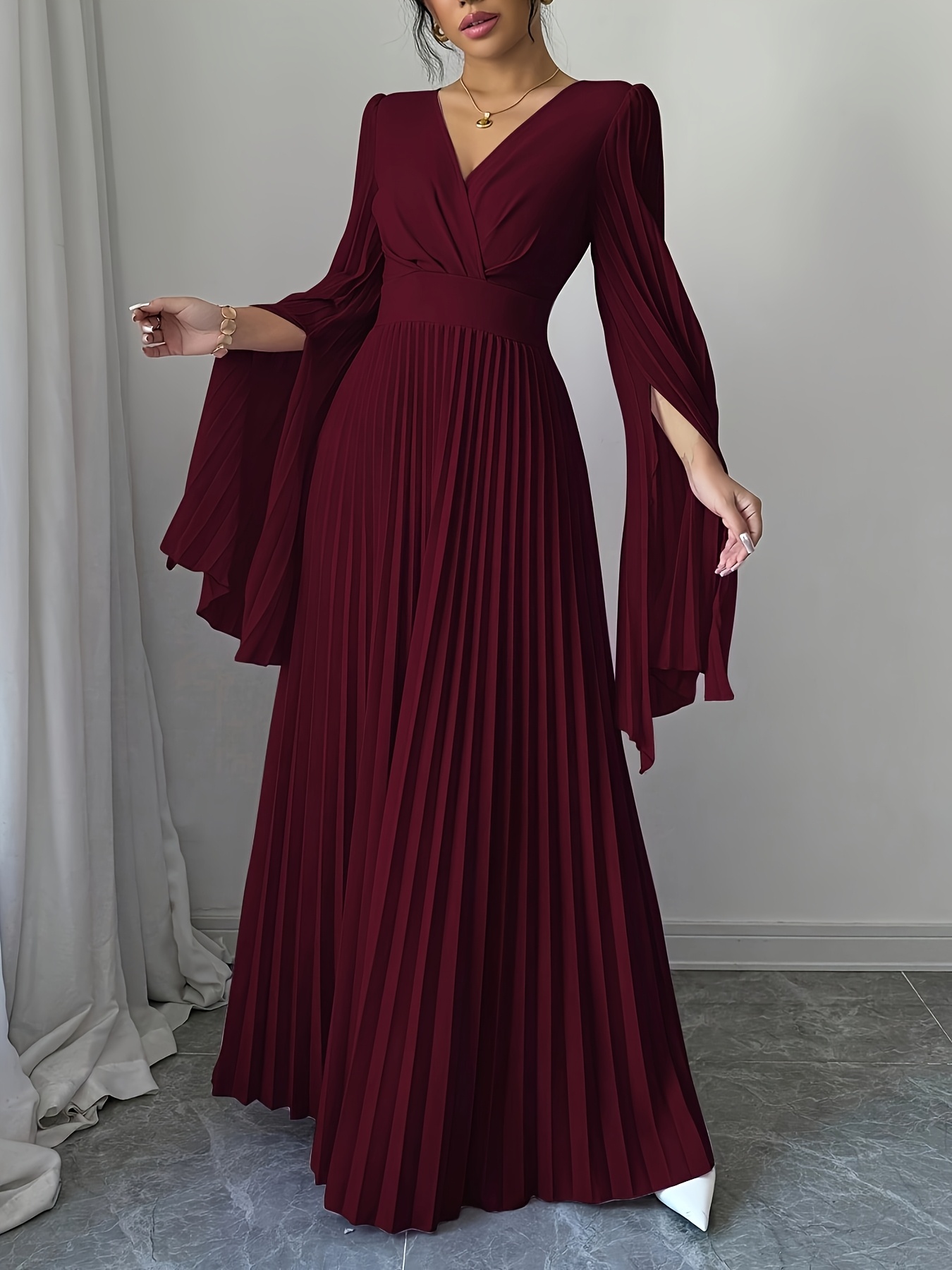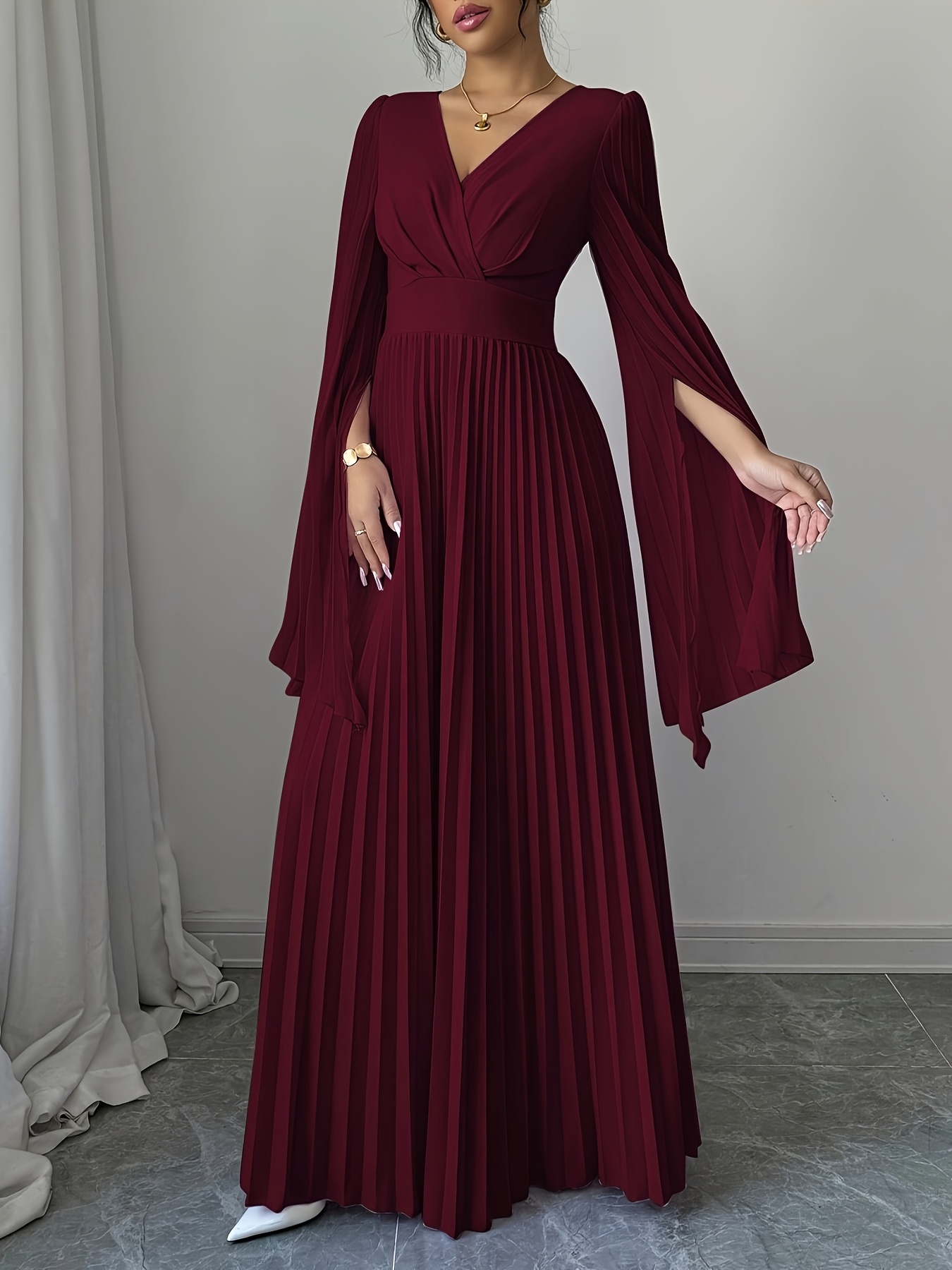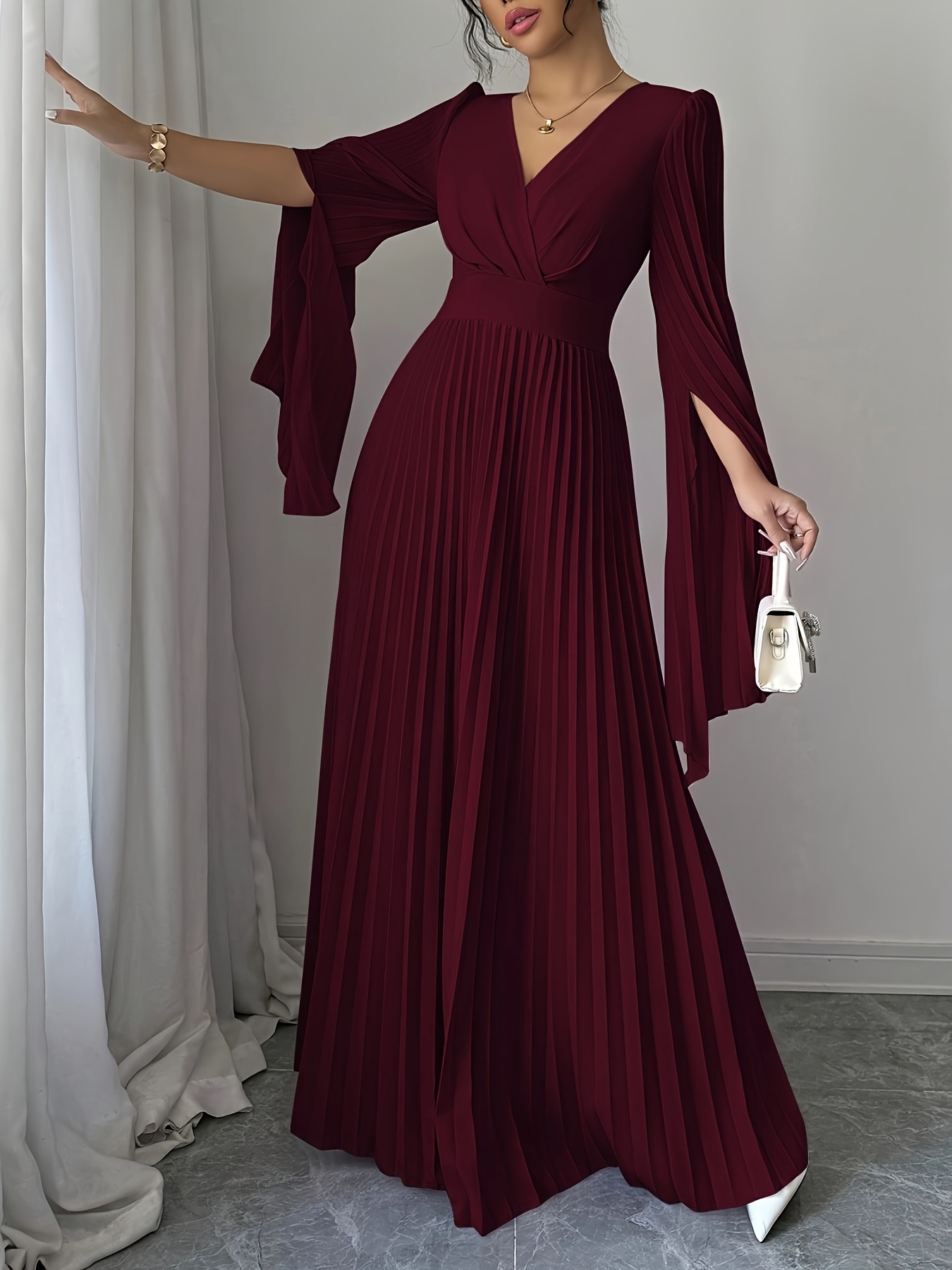 Elegant Long Sleeve V-Neck Pleated Maxi Dress with Side Slit - Maroon, Cinched Waist, Flowing Design for Women, Perfect for Spring & Fall, Cute Dress
