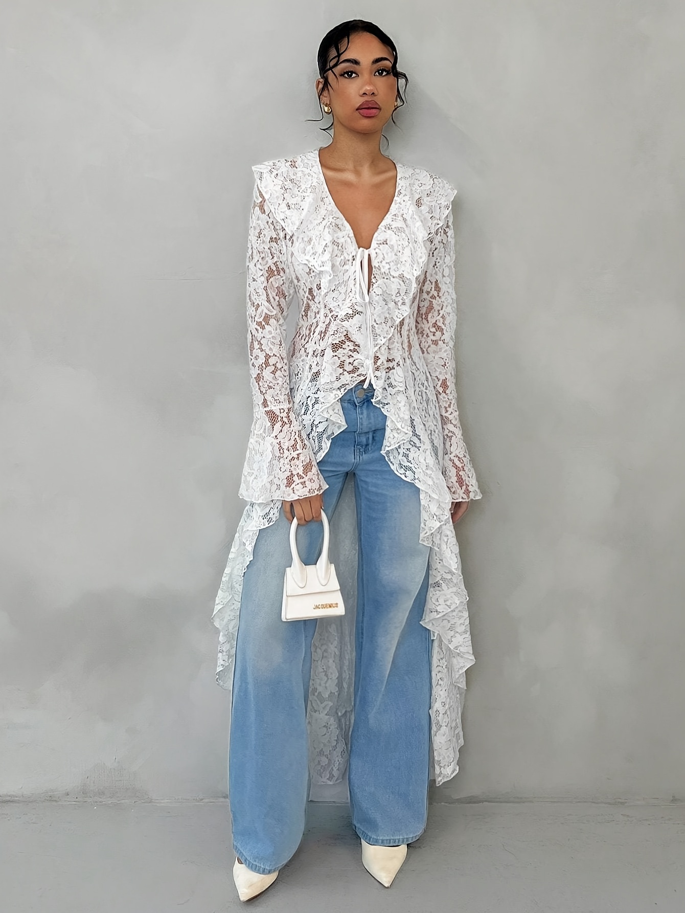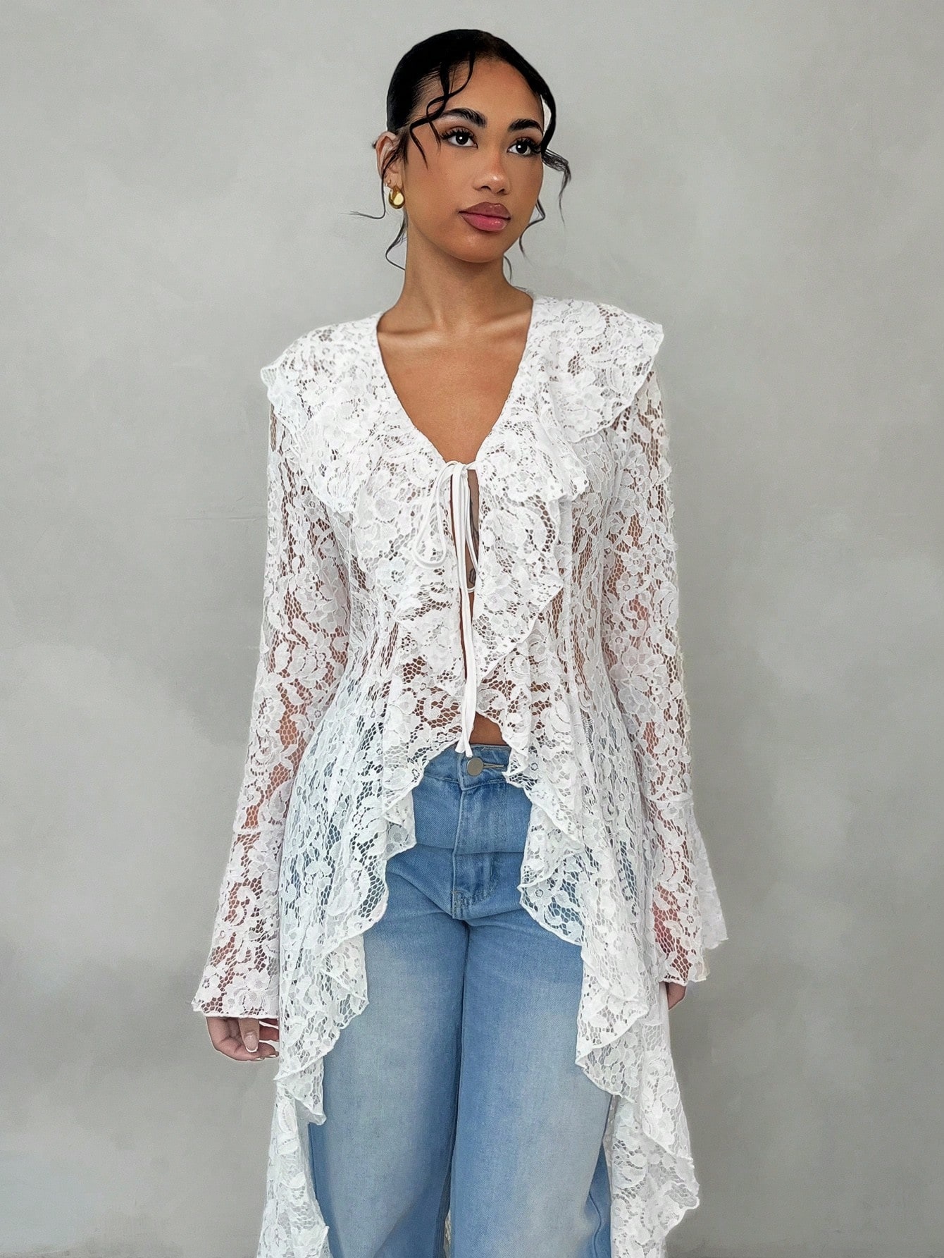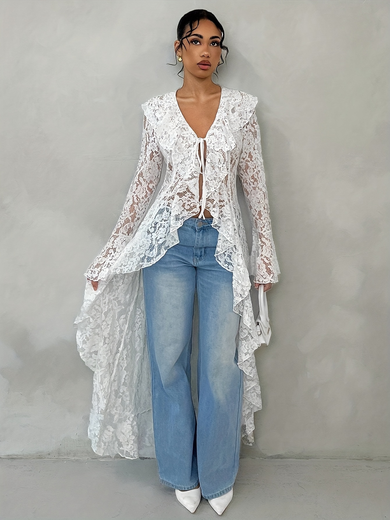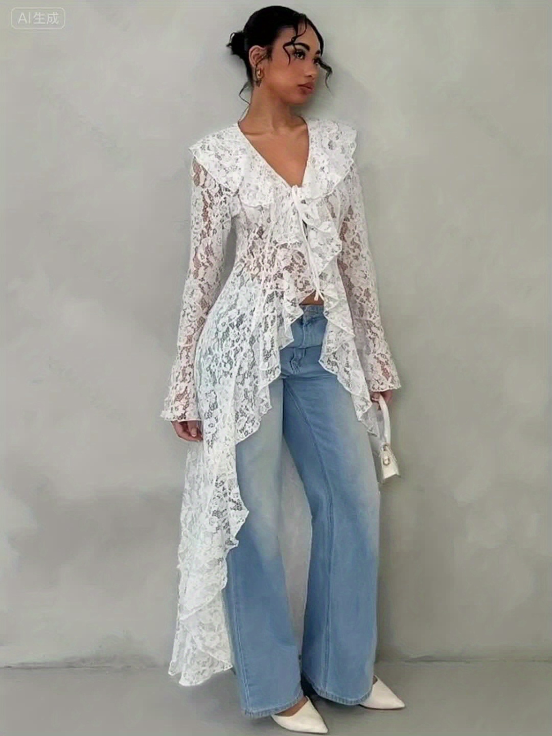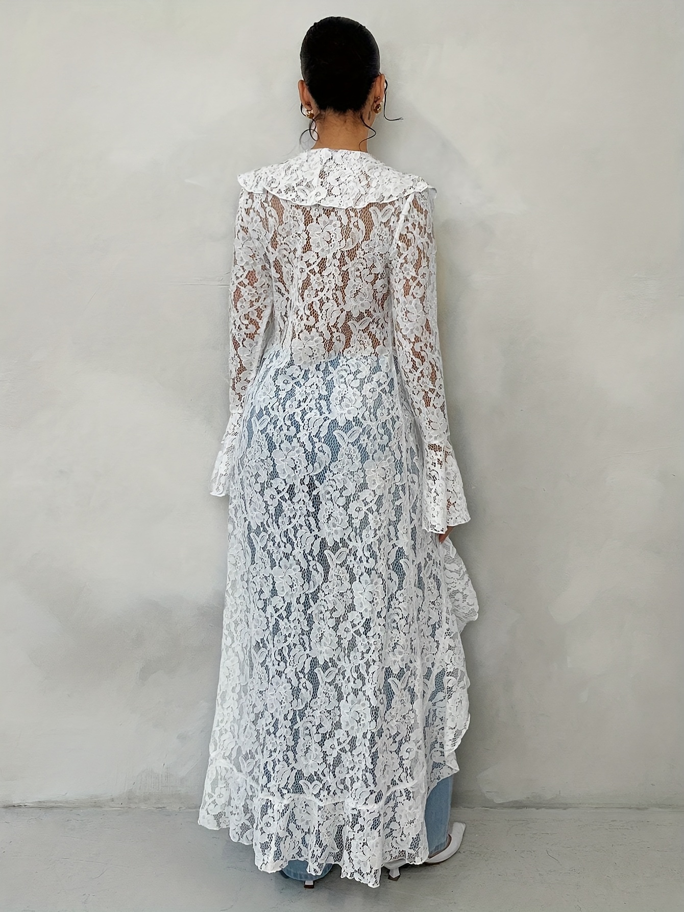 Spring-Summer Romantic Vacation Elegant Sheer Lace Trim Women's Long Thin Coat, Lightweight Coverup, Spring Fashion, Sheer Design, Delicate Detailing, Lace Overlay, Fine Stitching, Stylish Outerwear, Thin Jacket, Trendy Ladies, Summer Wardrobe
