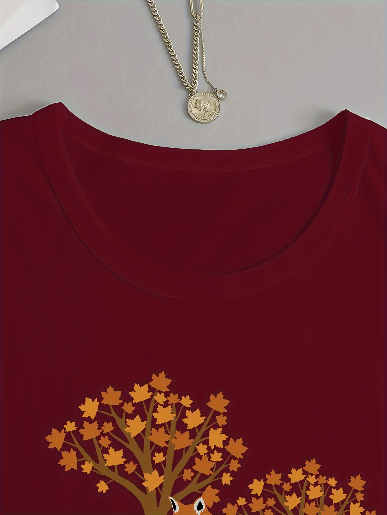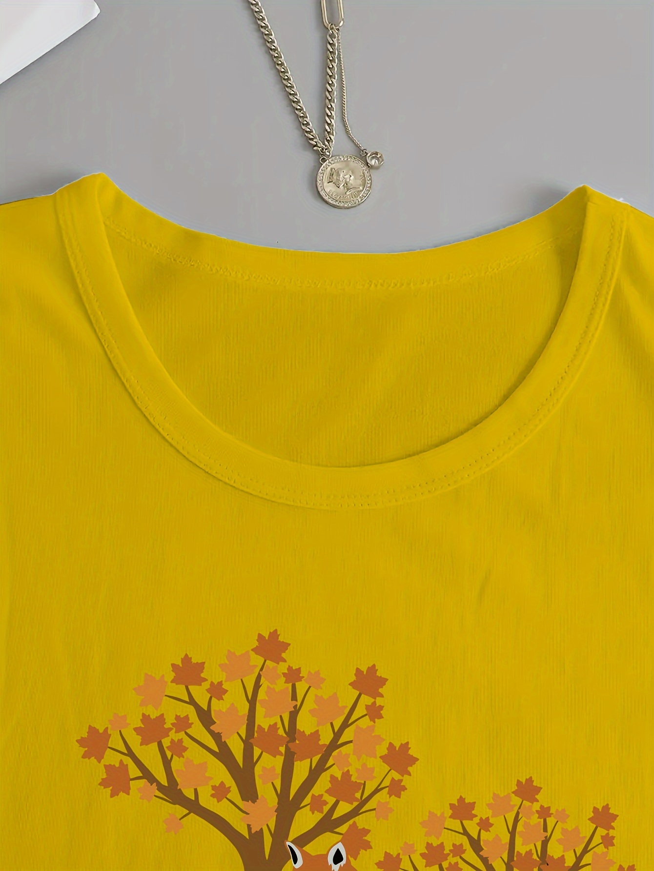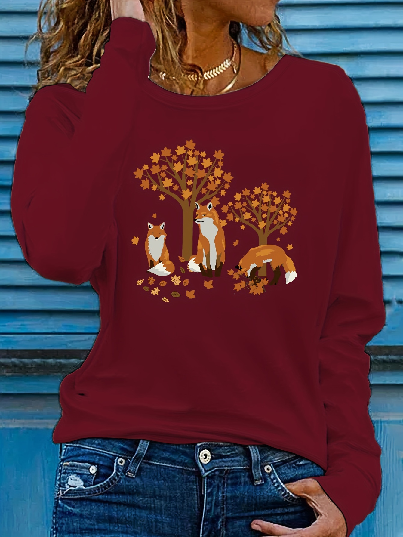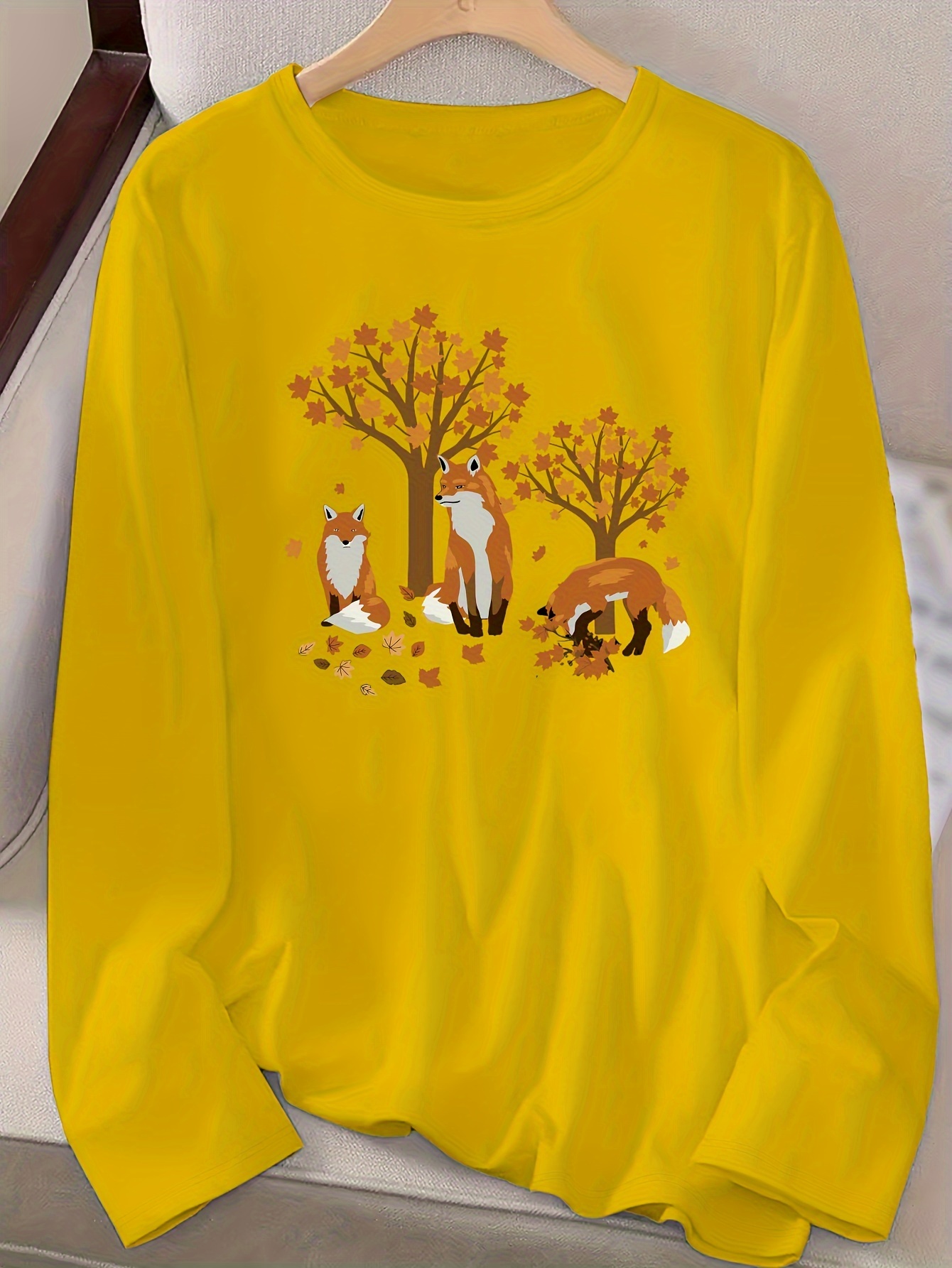 Women's Casual Long Sleeve Crew Neck T-Shirt - Fox & Autumn Leaves Graphic Print, Black with Orange Design, Medium Stretch, Machine Washable, All-Season Comfort Top, Naturethemed Apparel, Nontransparent Fabric