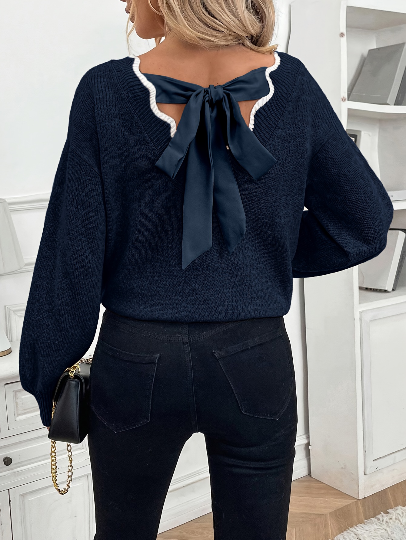 Women'S Elegant French-Inspired V-Neck Sweater with Back Bow - Long Sleeve Loose Fit Pullover, Soft & Brown Color Block Design, Fall/Winter Casual Chic Sweater, Sweater For Winter, Fall Fashion, Sophisticated Style, Quality Stitching, Stylish Top
