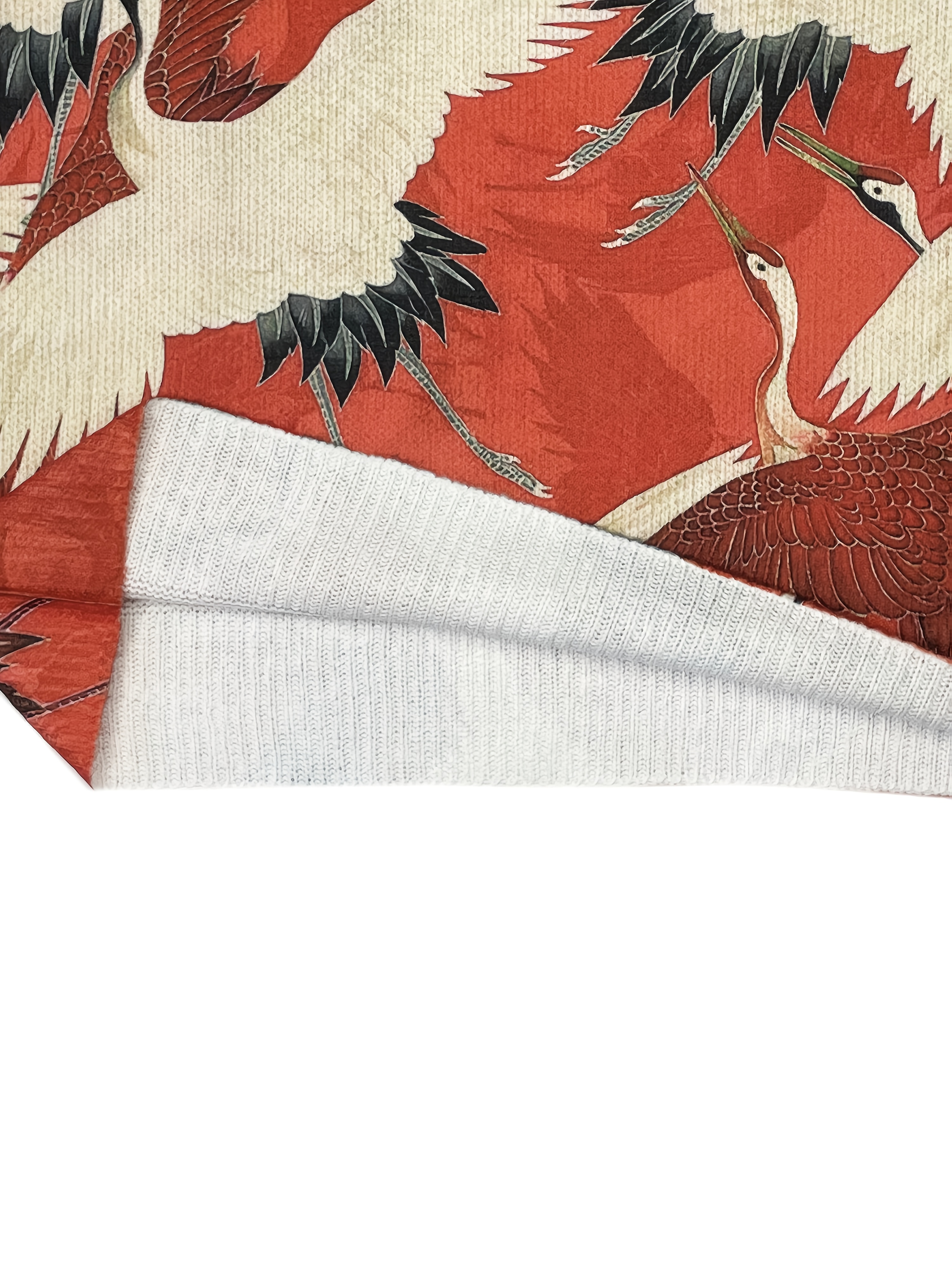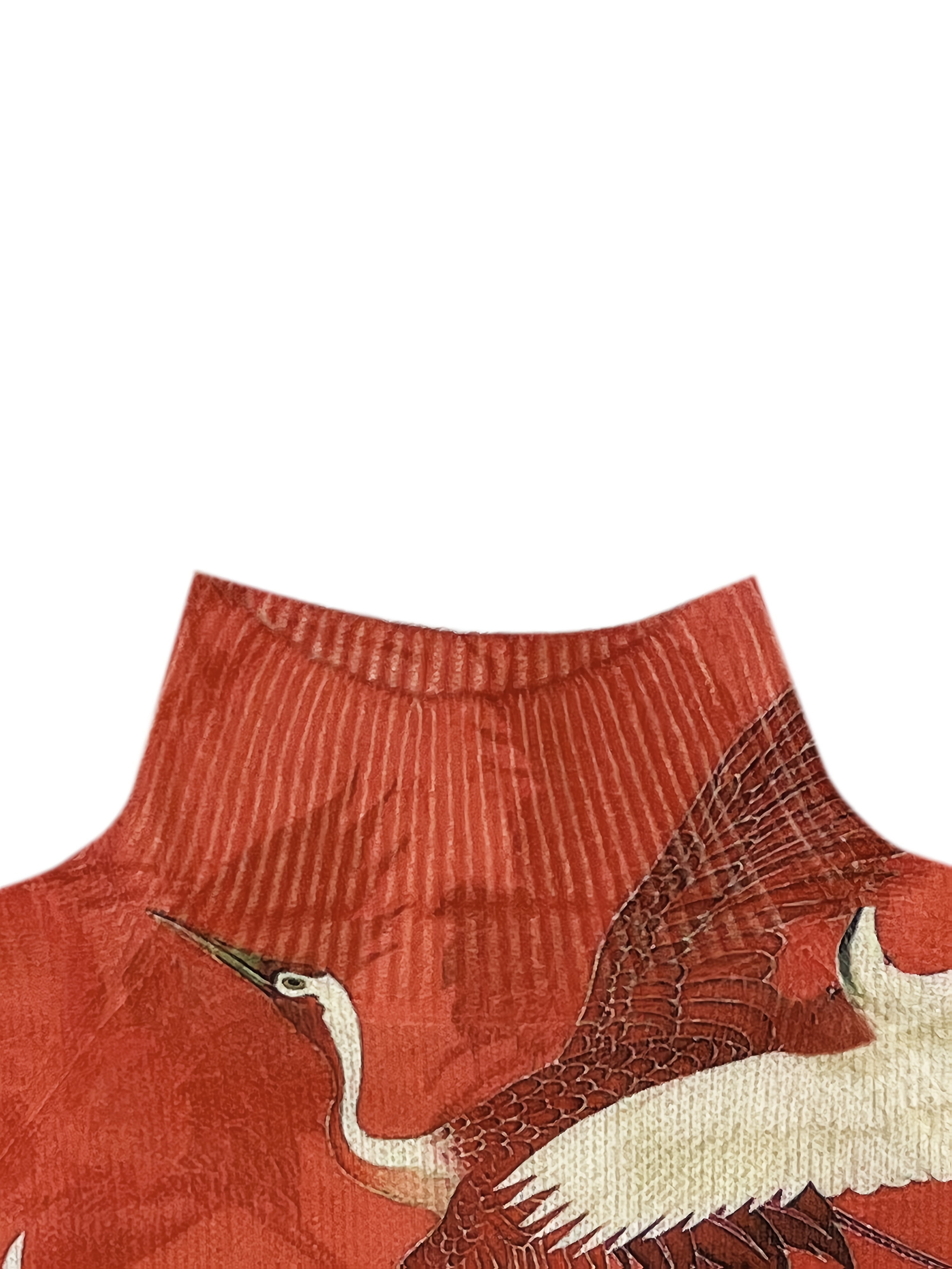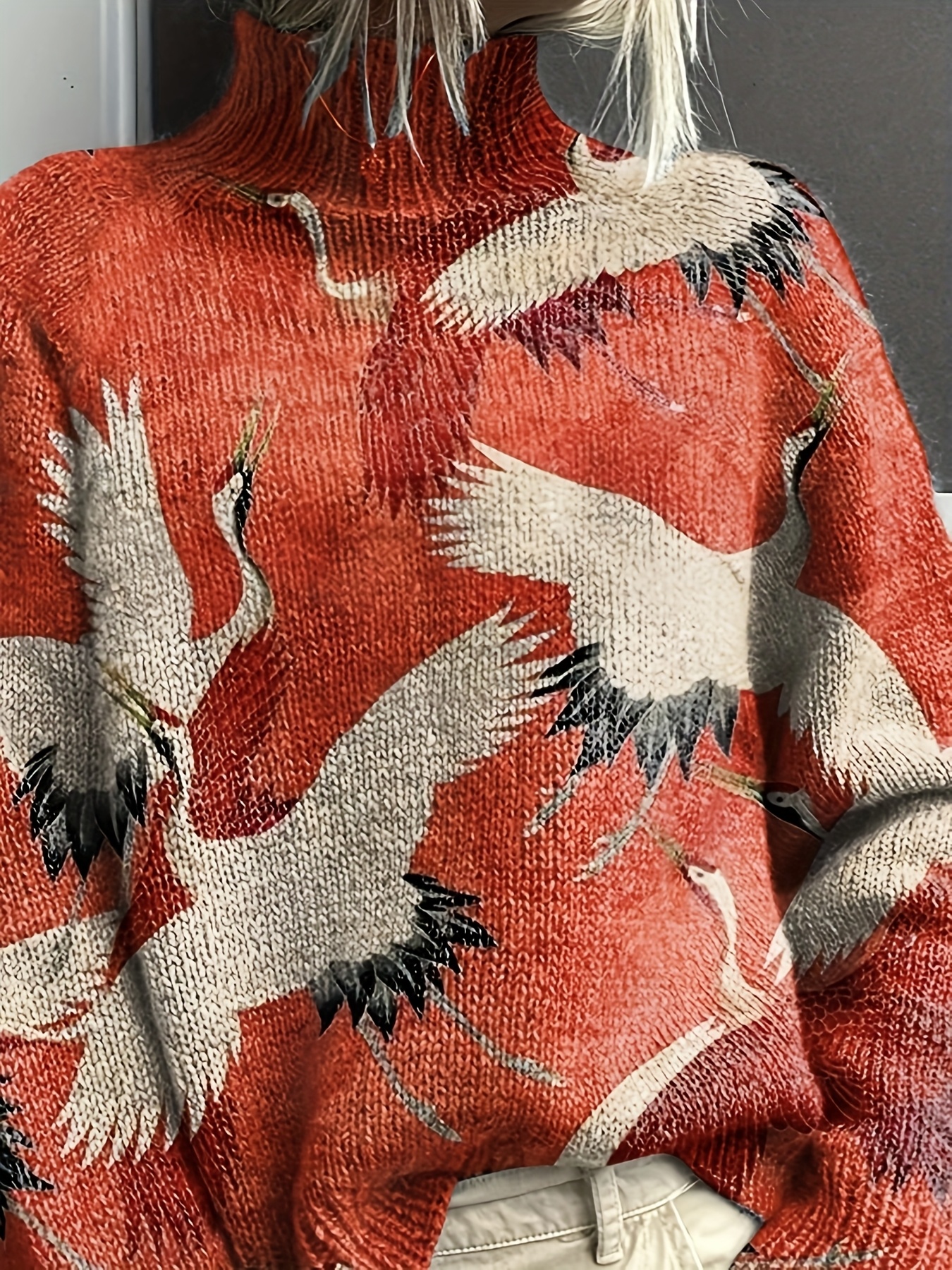 Women's Elegant Turtleneck Sweater - All-Over Crane Print in Red/Beige/Black/White, Soft Warm Pullover for All Seasons, Casual & Formal Wear, Turtleneck Sweater, Allseason Apparel, Highneck Design, Textured Knitwear, Quality Craftsmanship