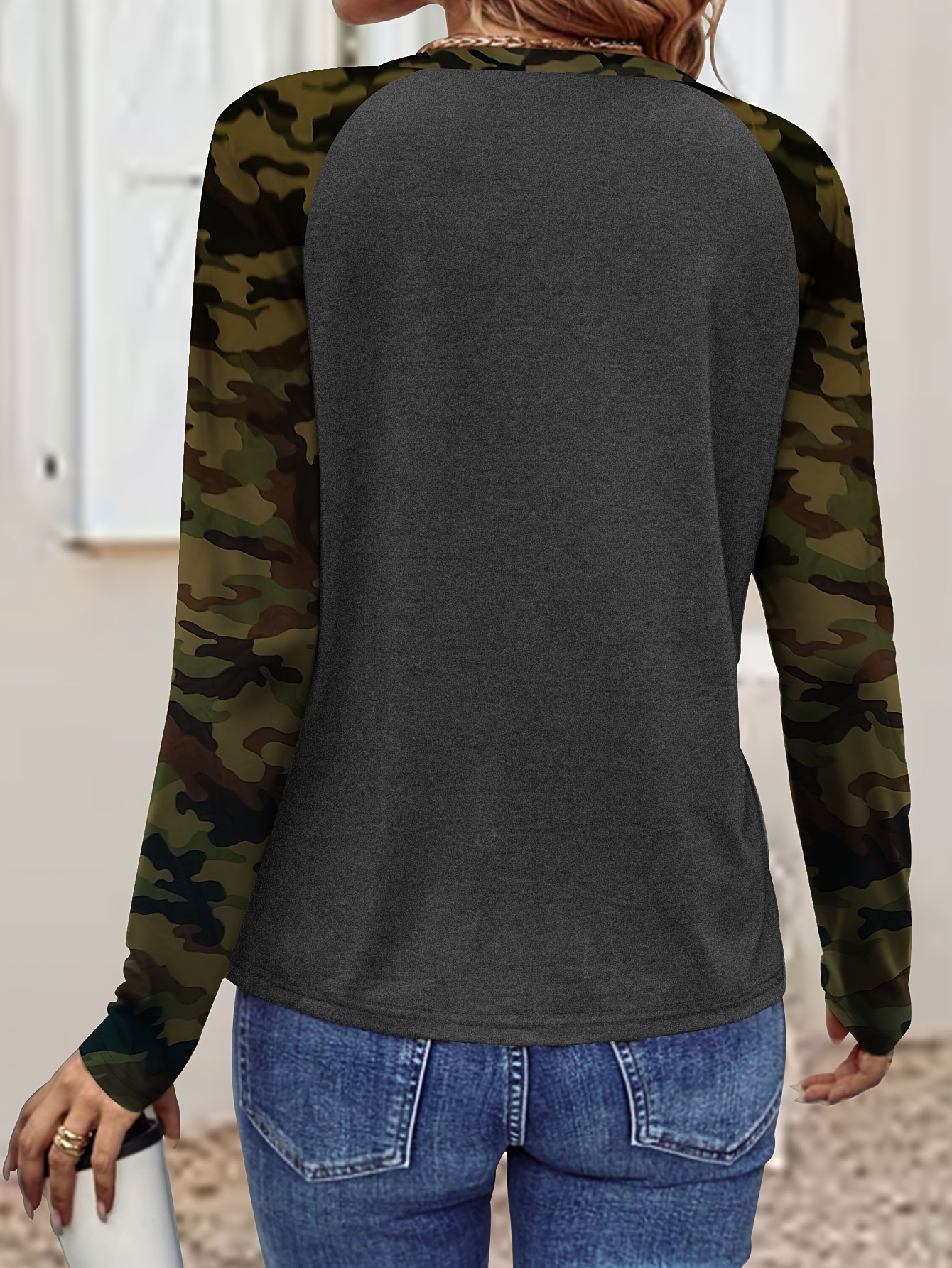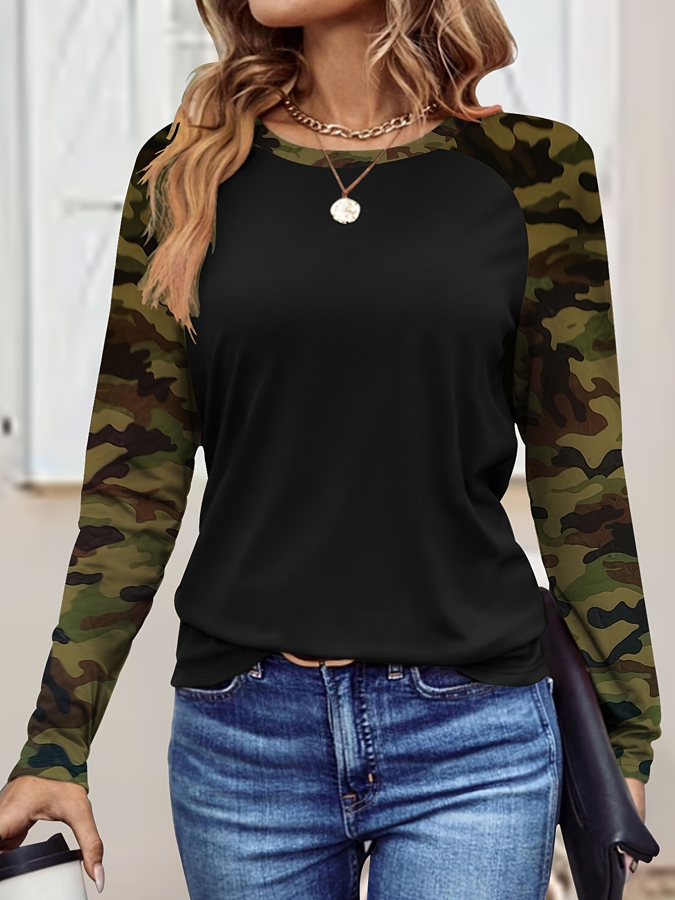 [Everyday Comfort] Women'S Camo Long Sleeve T-Shirt - Casual Crew Neck, Stretchy Fabric, Regular Fit with Asymmetrical Hem, Perfect for Spring & Fall, Ladies T Shirts