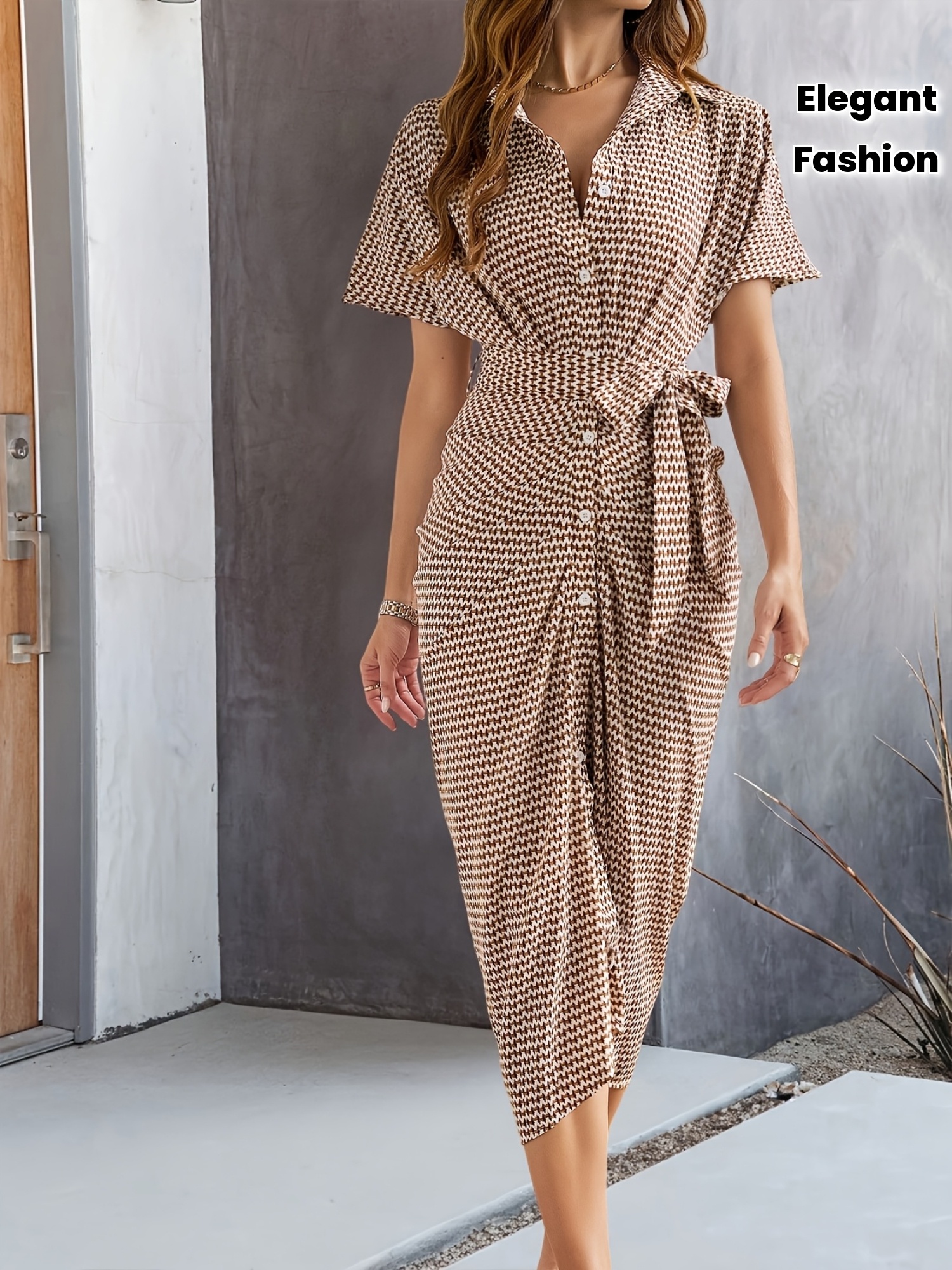 YY0511330 Spring-Summer New Fashionable Elegant Women's Full-Print Short Sleeve Shirt Dress with Single Button Pleated Mid-Length Tie-Waist Dress