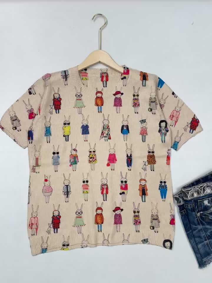 [All-Over Print] [Thin] [Sweater] All-Over Print Rabbit Woman Pattern Thin, Casual Crew Neck Short Sleeve Sweater, Women's Clothing Mother's Day Gift