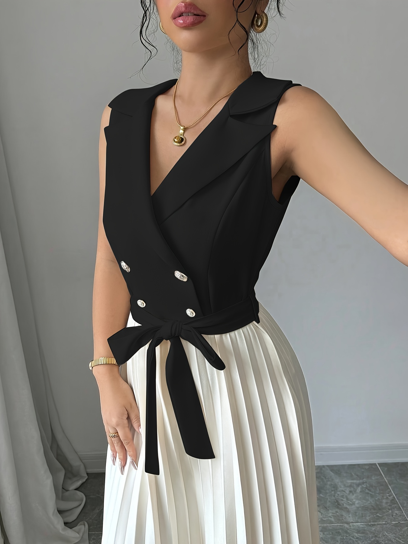 Women'S Elegant Double-Breasted Ruched Sleeveless Dress - Black and White Color Block, Polyester, A-Line Silhouette, Perfect for Spring/Summer Commute and Casual Attire, Casual Attire|Ruched Texture|Polyester Dres