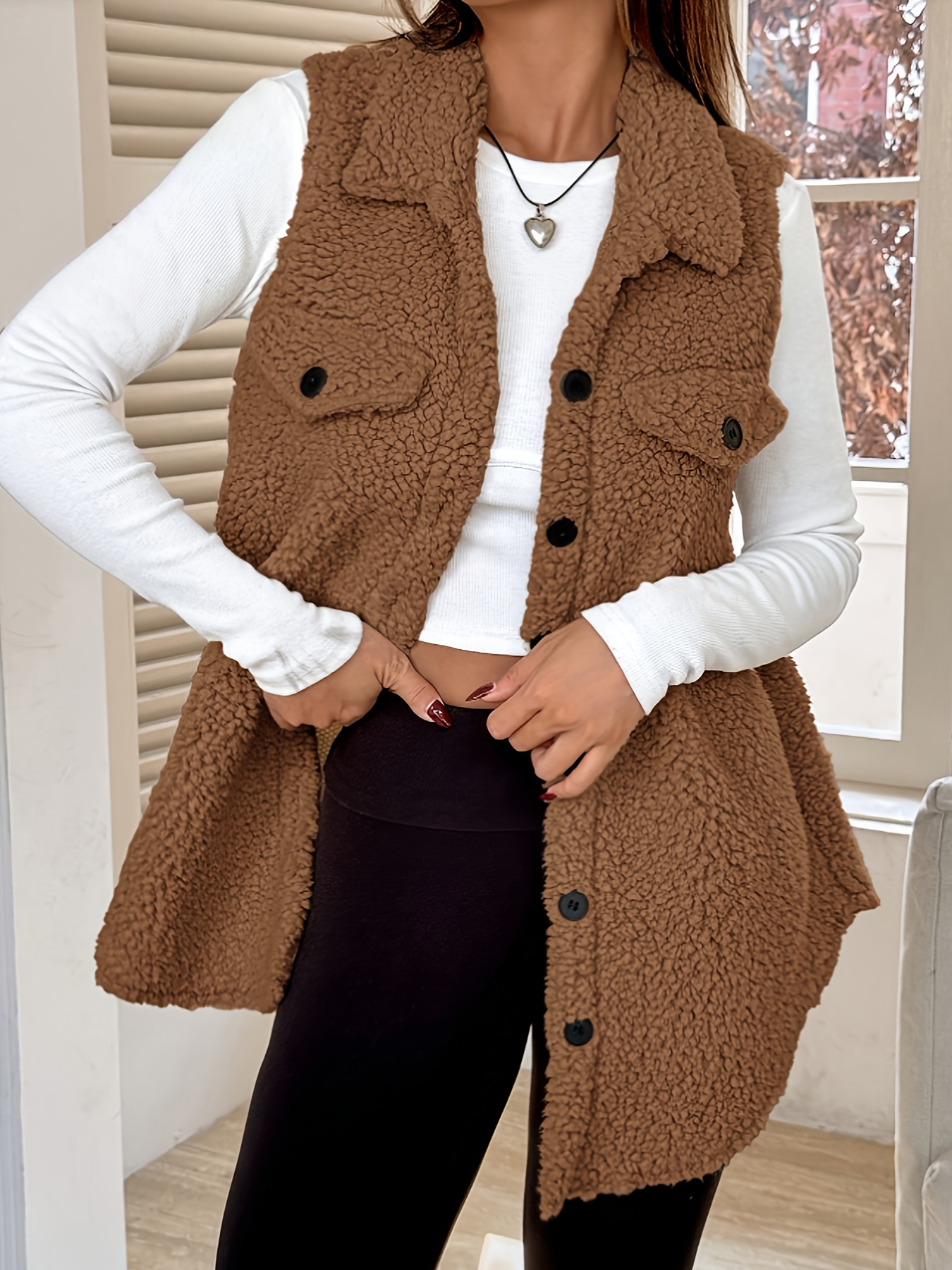 Women'S Elegant Sleeveless Flat Collar Button Front Jacket with Faux Pockets - Cozy Brown Plaid Pattern, Long Length, Perfect for Fall/Winter Casual Wear, Winter Clothes