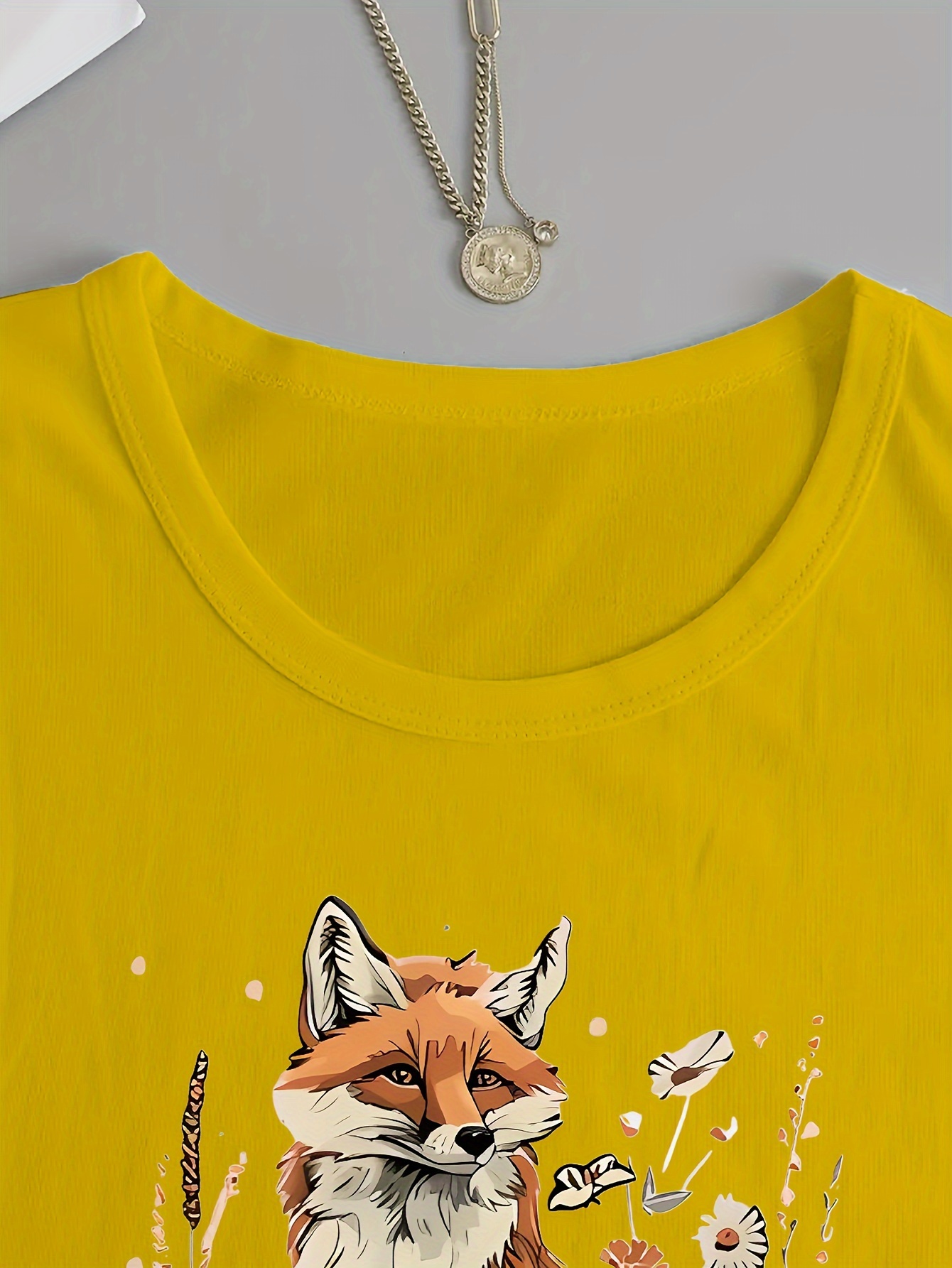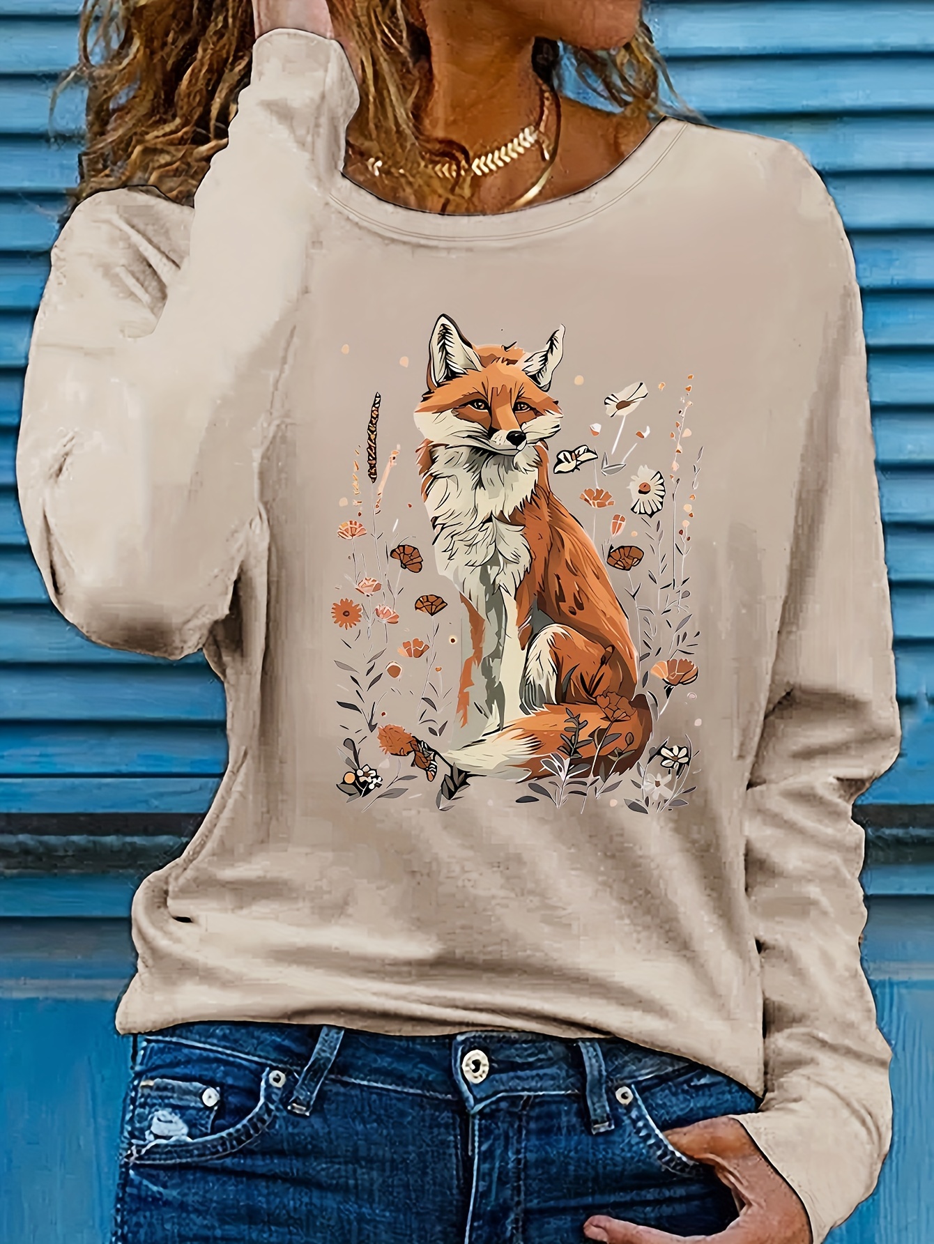 Women's Fox & Floral Graphic Print Long Sleeve T-Shirt - Soft Stretch Crew Neck Casual Top for Spring & Fall, Machine Washable Regular Fit, Medium Elasticity Shirt